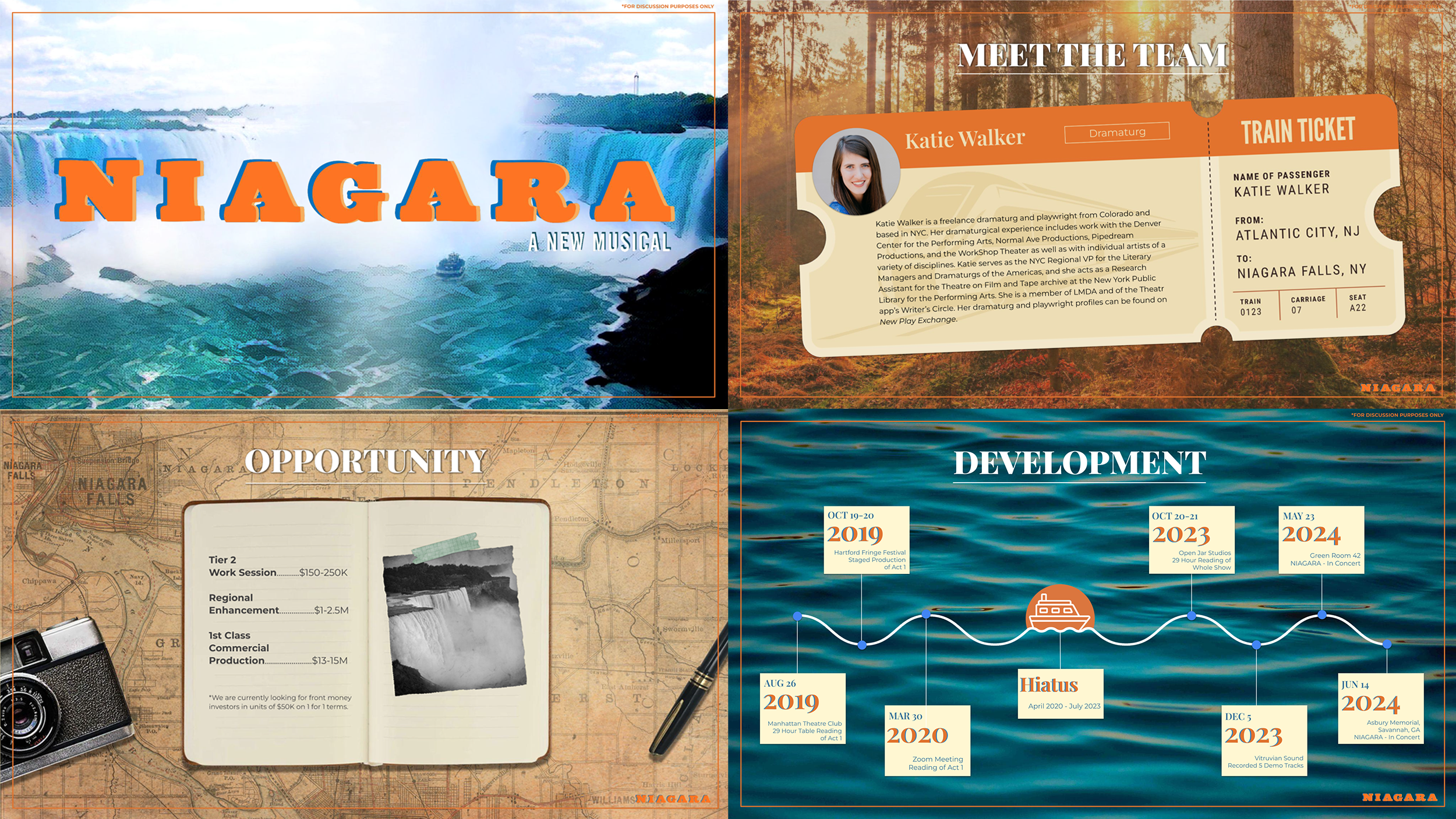 I had the opportunity to design a pitch deck for an upcoming Broadway musical. This deck was created with the goal of attracting investors and bringing the show's creative vision to life. The deck was crafted to not only inform but also to creatively represent the story. One of my favorite aspects of this project was being able to incorporate subtle imagery tied to key characters and moments in the play to help facilitate a deeper connection to the story.